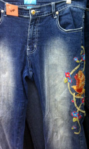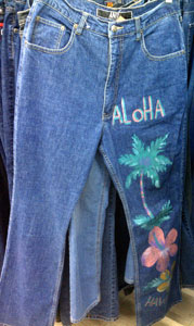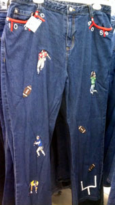 While the pair on the right is relatively understated as embellished jeans go, the pair on the left is about as embellished as you can get. The football theme starts with the "yard lines" around the pockets and continues past the football players down to the goal post at the ankle. The middle pair, with its Hawaiian theme, is my least favorite kind of embellished jeans: the painted jeans. Painted jeans almost always wind up looking like someone got bored in art class and started doodling away on their pants, instead of like an intentional fashion statement.